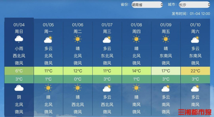 正值“三九”前后,一波冷空气结束之后,湖南大部将开启回暖模式。以湖南长沙为例,1月5日至10日,最高气温将稳步回升至22℃,但昼夜温差较大,最低气温在1—3℃。